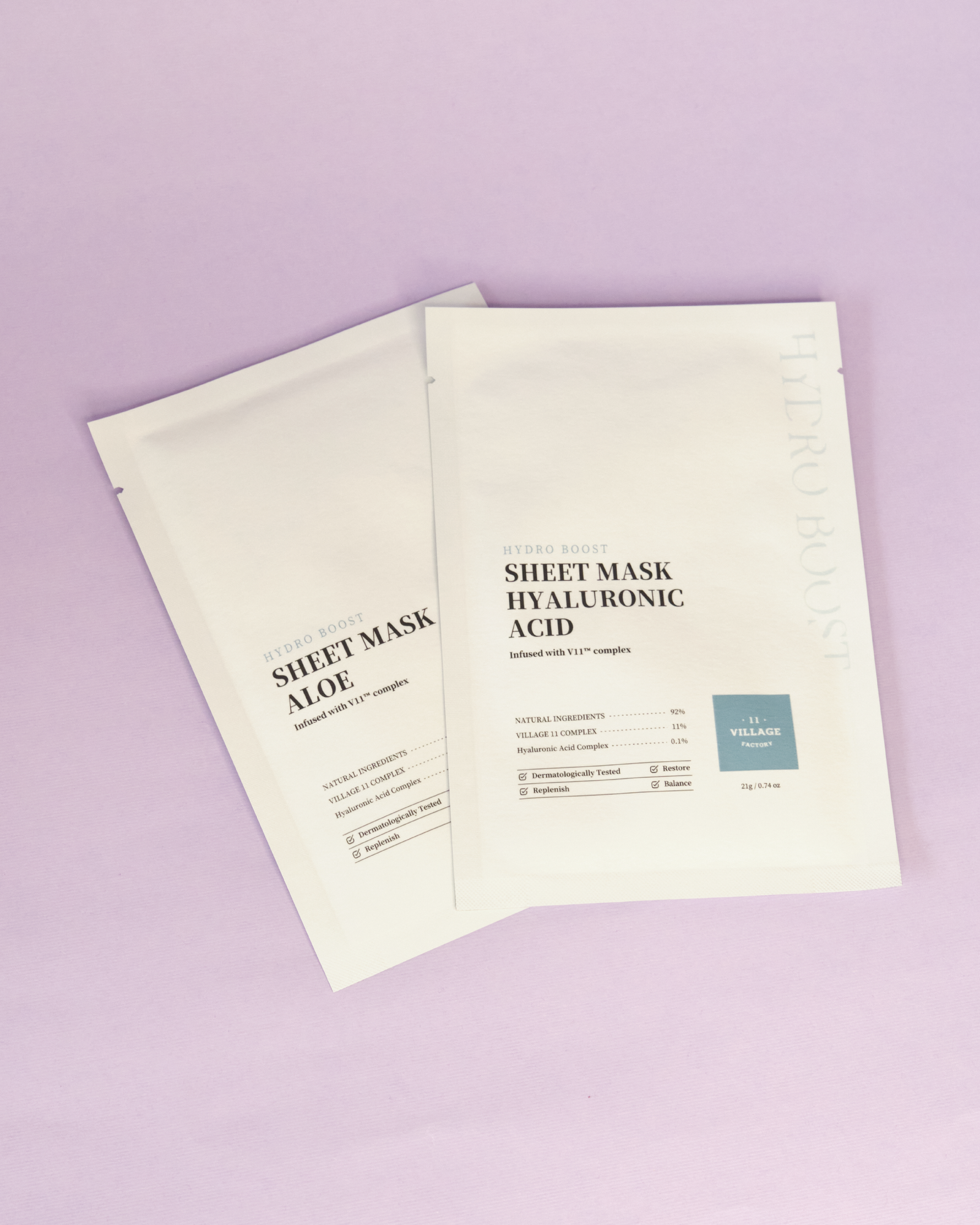 Maska pëlhure janë një mënyrë e lehtë dhe efektive për t'i dhënë lëkurës tuaj një nxitje të menjëhershme dhe të madhe të vitaminave dhe lagështisë. Ato janë gjithashtu një mënyrë argëtuese për t'u çlodhur dhe përkëdhelur veten në shtëpi! VILLAGE 11 FACTORY Hydro Boost Sheet Mask, janë të zhytura dhe njomura me kompleksin ekskluziv V11™ të Village 11 - që përmban një sinergji prej 11 përbërësish të zgjedhur me dorë për të balancuar, hidratuar dhe promovuar lëkurë më të shëndetshme.