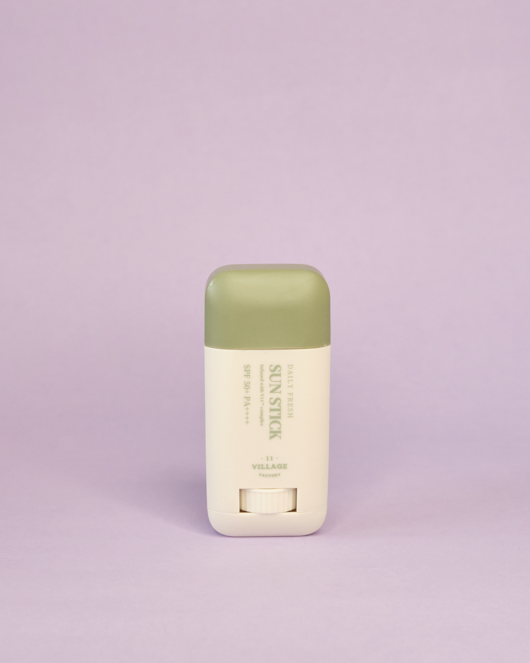 VILLAGE 11 FACTORY Daily Fresh Sun Stick SPF50+ PA++++, i dizenjuar në mënyrë përfekte nga marka më e re Village 11 Factory, është krijuar për t'u aplikuar dhe riaplikuar çdo ditë në lëkurë falë formës së tij në trajë stick-u. Formulimi i tij me teknologjinë e patentuar V11™️ ndihmon në rritjen e elasticitetit duke i ofruar ushqim lëkurës. Nga ana tjetër, përmbajtja me vitaminë E, ekstrakt jamballi dhe pemës së çajit, ofrojnë hidratim dhe qetësim të menjëhershëm lëkurës së irrituar, sensitive dhe me tendencë akneike. Konsistenca e tij është e butë si pambuk, dhe falë pudrës silica me madhësi shumë të vogël, gati mikroskopike, bën të mundur përthithjen e sebumit të tepërt të krijuar gjatë ditës, duke krijuar një shtresë mat mbi lëkurë.